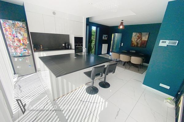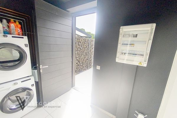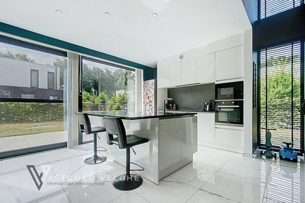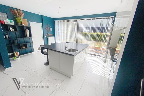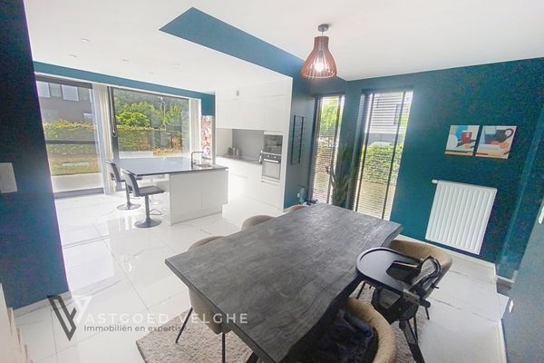 Indeling: - Gelijkvloers: inkomhal met vestiaire en gastentoilet, leefruimte met eetplaats en keuken met eiland, bergplaats, inpandige garage.